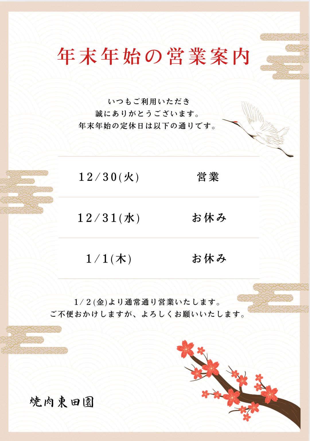 いつも東田園をご利用いただき誠にありがとうございます。年末年始のお知らせです。2026年も東田園をどうぞよろしくお願いいたします。